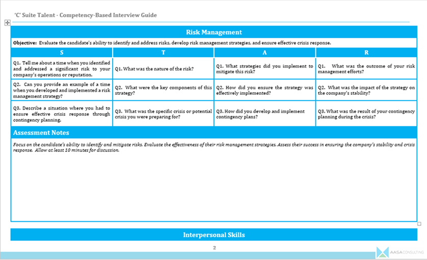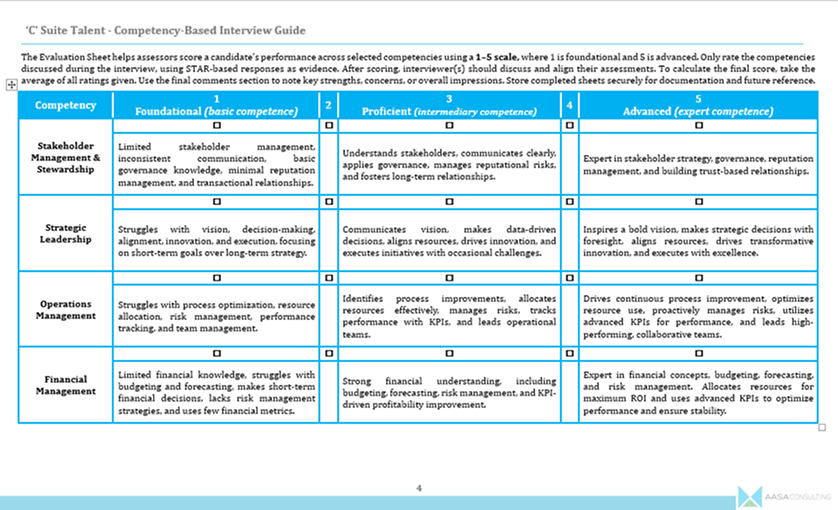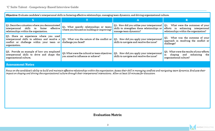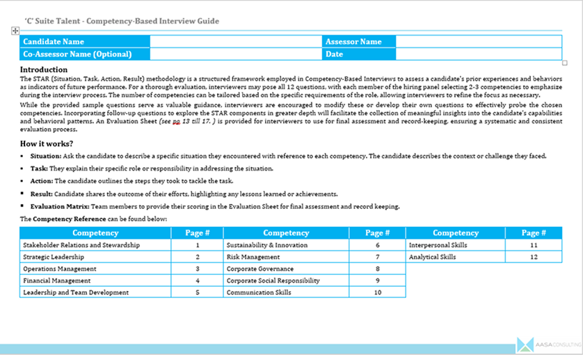 Based on the proven method of the STAR (Situation, Task, Action, Result) Framework, this resource contains 12 major Competency Based Indexes on Stakeholder Relations and Stewardship, Strategic Leadership, Operations Management, Financial Management, Strategic Leadership, Sustainability & Innovation, Risk Management, Corporate Governance, Corporate Social Responsibility, Communications Skills, Interpersonal Skills and Analytical Skills. Containing a total of 144 assessment questions and a comprehensive Evaluation Matrix, this tool allows organizations to successfully assess and hire the best talent and to support aspiring executives in navigating the hiring process from the organization’s perspective.