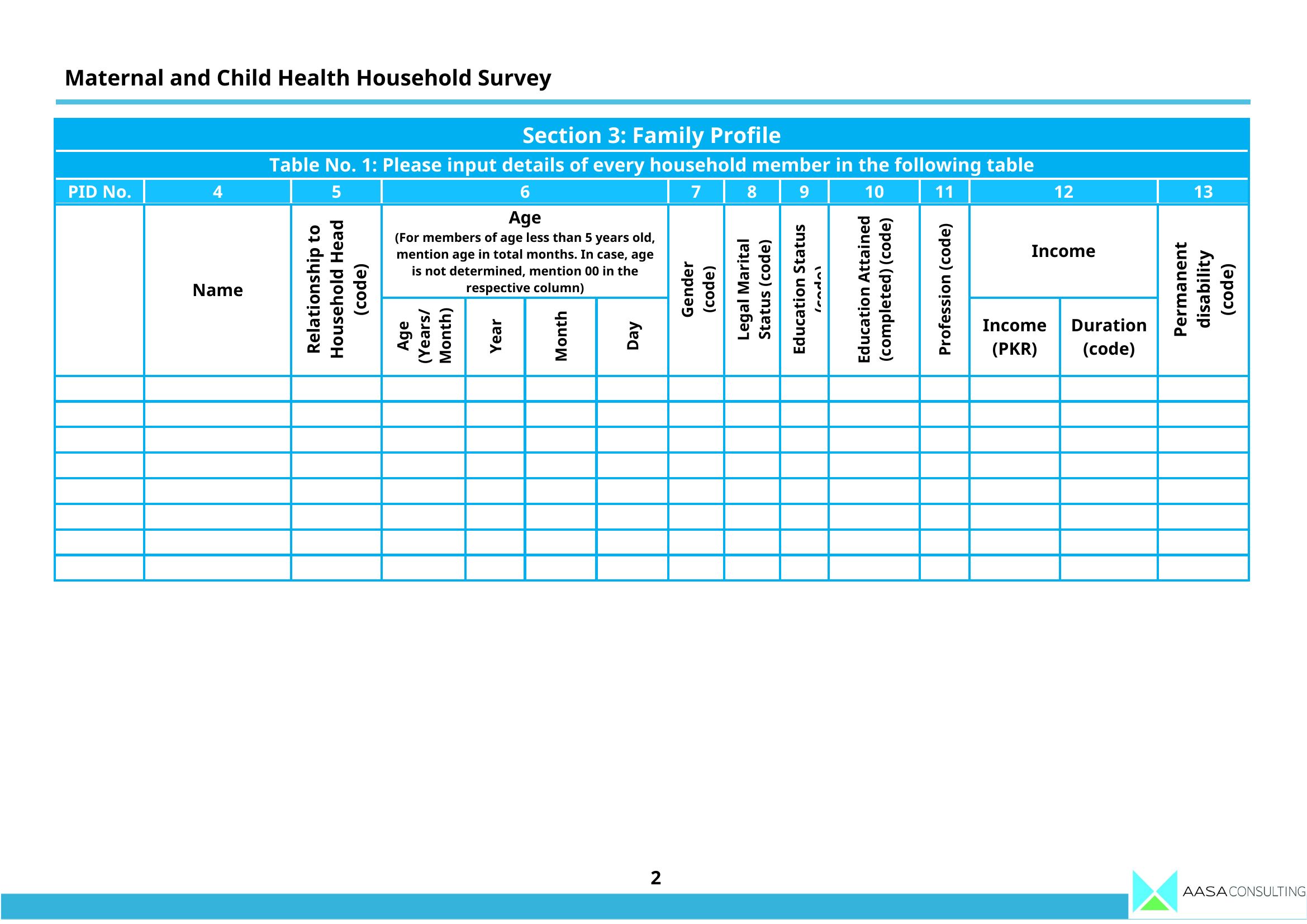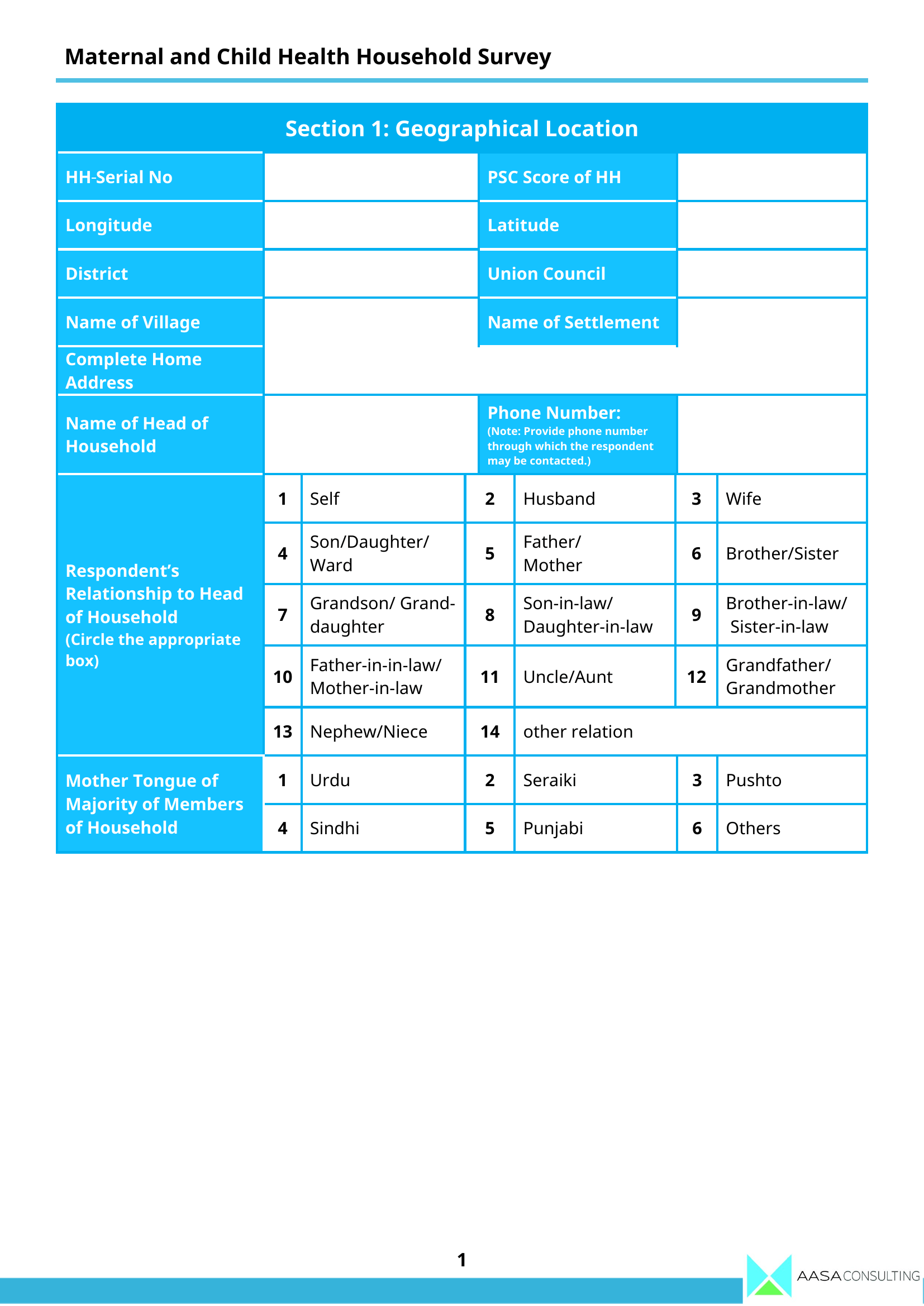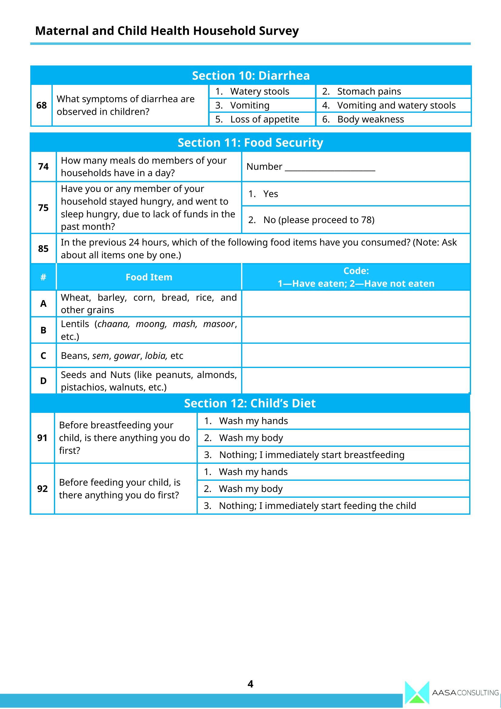 This Maternal and Child Health Household Survey is designed and field-tested by experts in public health, nutrition, and social research to assess and improve dietary deficiencies, hygiene, sanitation, and child nutrition in Pakistan. Built on global best practices, it enables organizations to gather actionable insights on household demographics, food security, health behaviors, and socio-economic conditions.