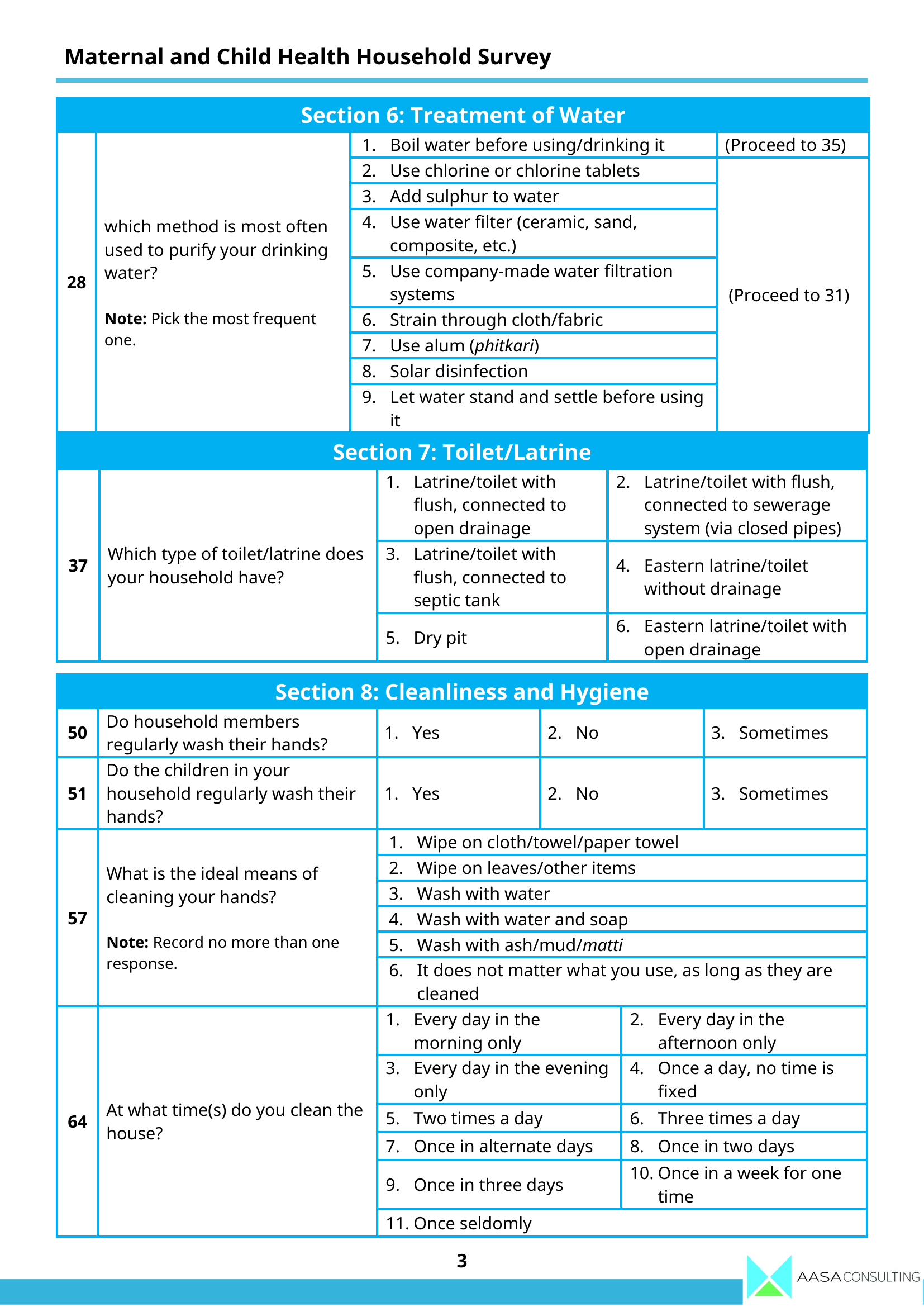 The survey features a structured, 15-sections and 145 questions + coding keys covering key areas such as household demographics, water and sanitation, hygiene, food security, child and maternal nutrition, agriculture, livestock, and income-expenditure profiles.